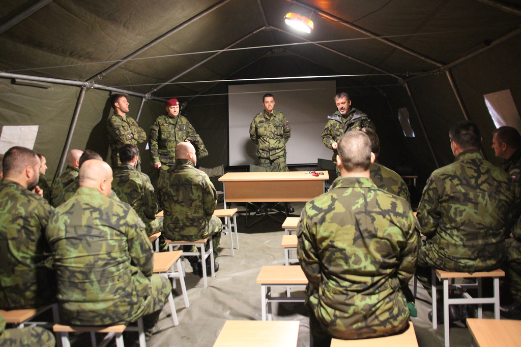 S vojáky 3. úkolového uskupení AČR eFP v diskuzi předseda Výboru pro zahraniční věci, obranu a bezpečnost Senátu Parlamentu ČR Pavel Fišer