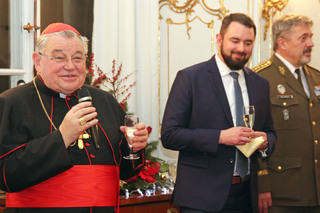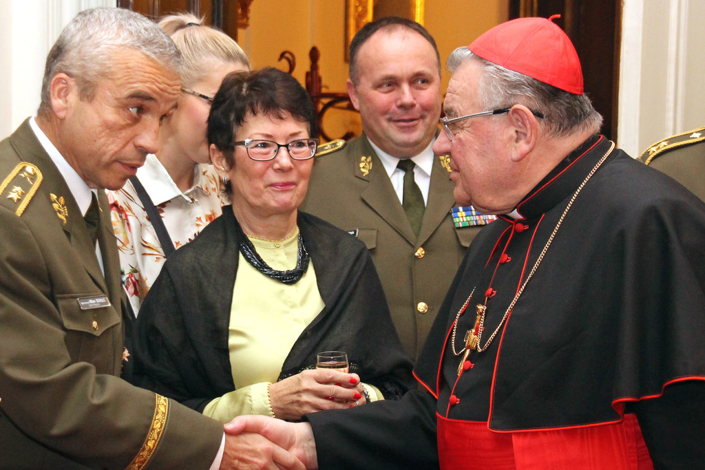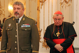 Kardinál Dominik Duka se zdraví se zástupcem náčelníka Generálního štábu, inspektorem Armády ČR generálmajorem Milanem Schulcem.