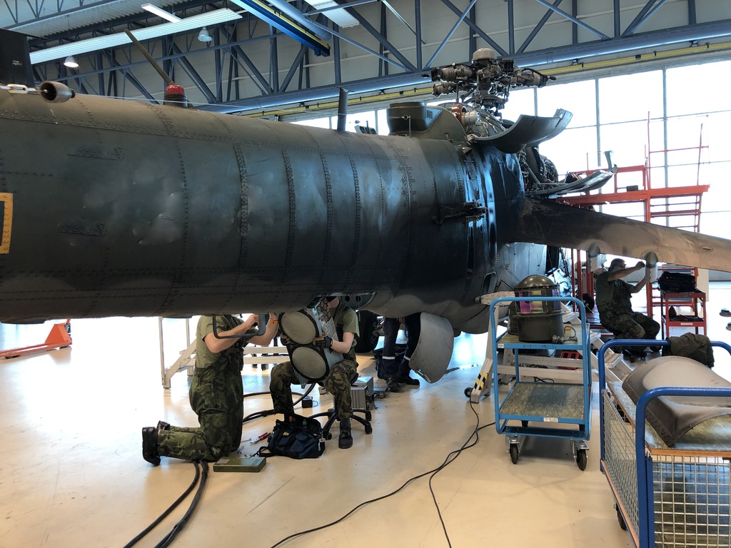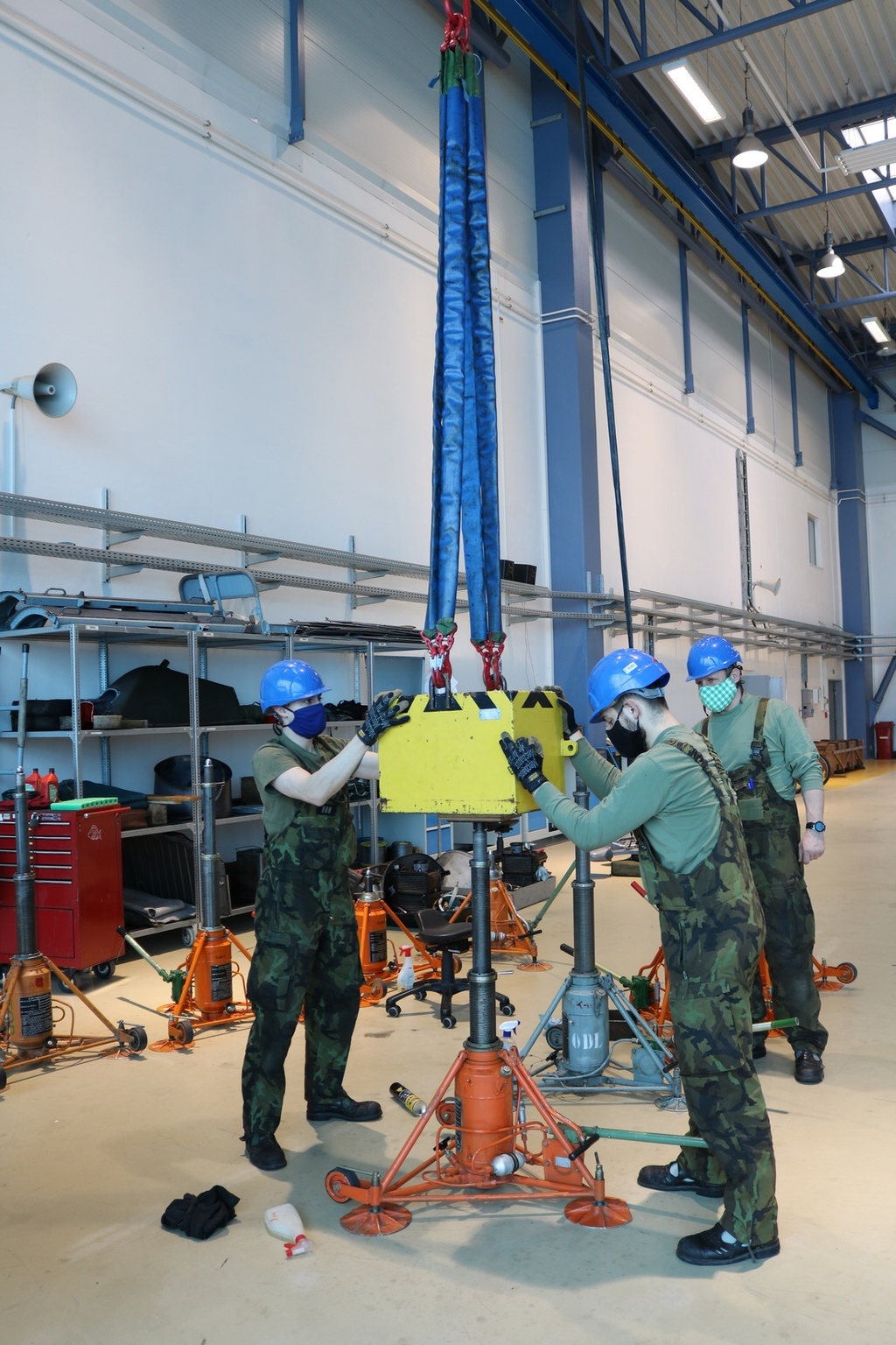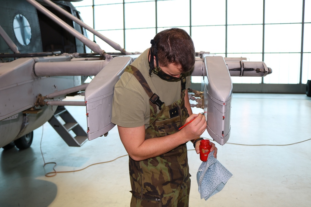 Skupina elektro z 223.lolt kontroluje sběrač proudu na hlavě nosného rotoru