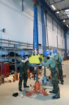 Technici v hale oprav musí v rámci údržby provést práce na zvedacím zařízení.