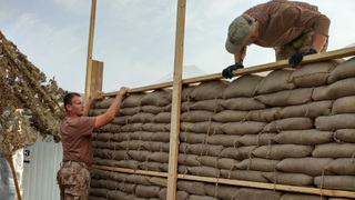 čet. Zdeněk Mondek a čet. Miloš Horčica vytváří nosnou konstrukci protipožární stěny mezi kuchyňským a odpočinkovým blokem, LSA (Life Support Area) Irák 2017
