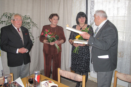 Zleva: Jiří Růžička-předseda českého svazu PTP, p. Dočekalová a Pavlíčková-pracovnice KVV Jihlava, Zdeněk Geist-předseda svazu PTP kraje Vysočina