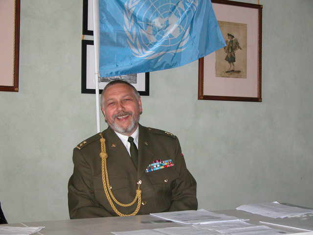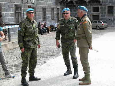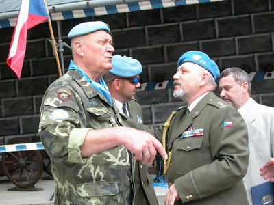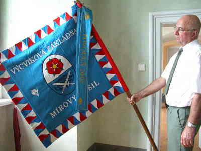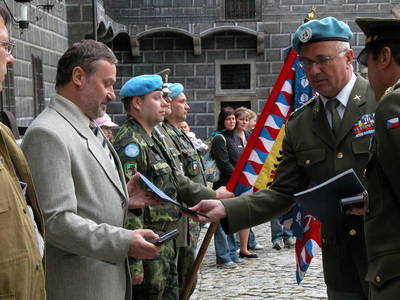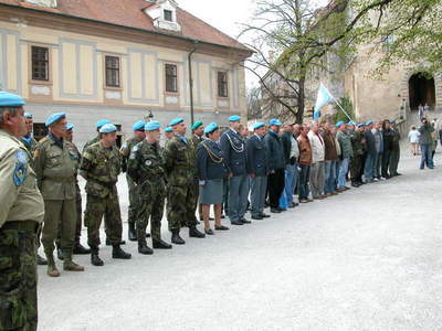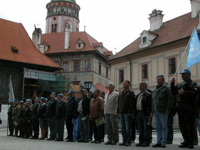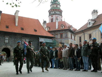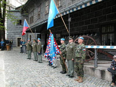 Bojový prapor zaniklé Výcvikové základny Mírových sil OSN v Českém Krumlově, který je jedním z artefaktů jihočeských veteránů, bude jednou z pěti zástav, které budou k vidění na Den vítězství na pražském Vítkově. Prapor drží představitel jihočeské organizace ČSOL pplk. Milan Čajdík