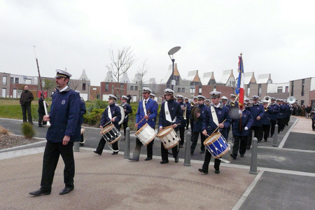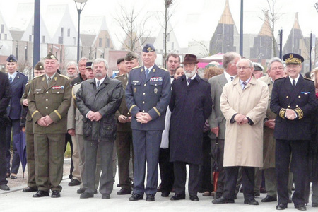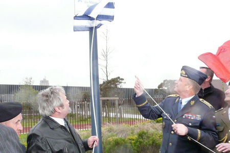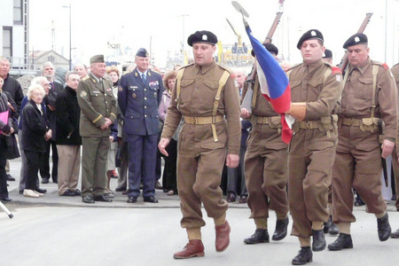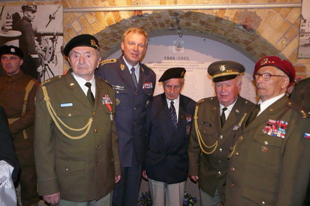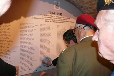 Generál Picek s českými veterány, přímými účastníky bojů u Dunkerque, před právě odhalenou pamětní deskou věnovanou padlým československým vojákům, vzpomínkový památník Bastion 32