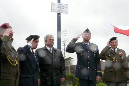 Generál Picek s Miroslavem Pelikánem a českými veterány vzdávají poctu právě odhalenému názvu ulice generála Aloise Lišky