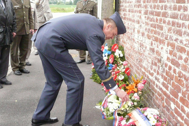 Symbolická tečka za slavnostním ceremoniálem, generál Picek položil kytici k pamětní desce ve Wormhoutu, kde byla podepsána kapitulace německé posádky Dunkerque