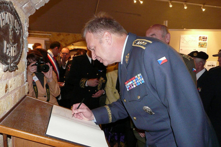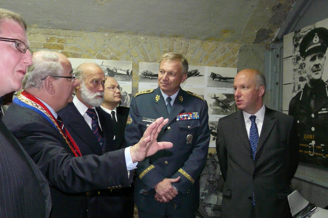 Starosta města Dunkerque seznamuje hosty s historickou expozicí, zleva Jiří Kittner, starosta Dunkerque, princ Michael z Kentu, generál Picek, velvyslanec ČR Pavel Fischer