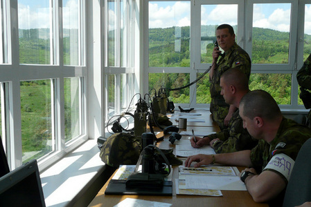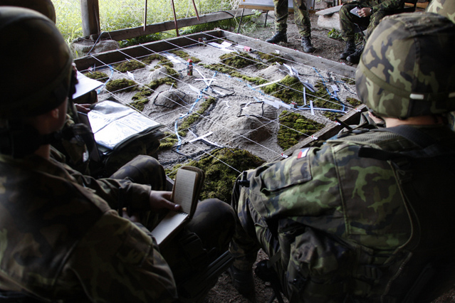 Na velitelském stanovišti plk. Hlaváč seznamuje generála Picka s plány výcviku