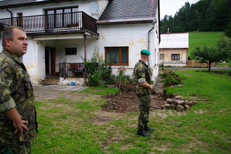 Vrchní praporčík 31. brchbo, štábní praporčík Martin Gajanec u domu, ve kterém žije rotmistr Tomáš L., kde obtékající proud vody doslova vyrval dlažbu od rohů