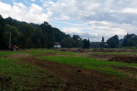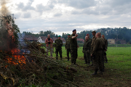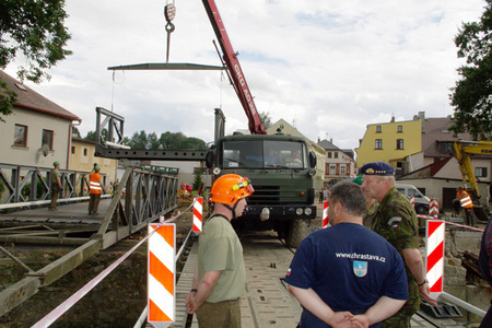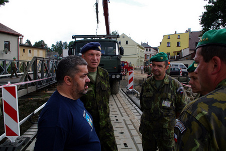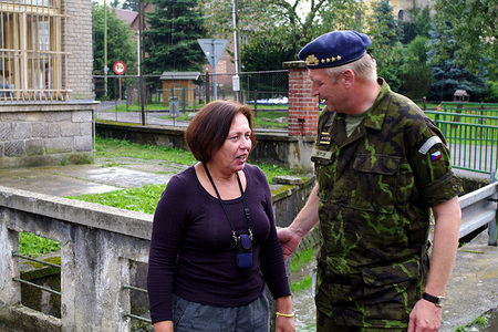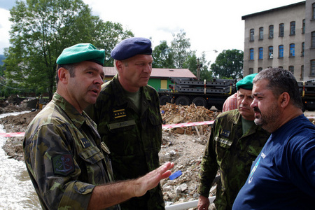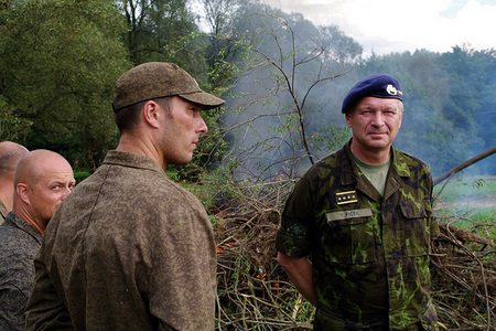 Zástupce velitele 15. ženijní brigády plukovník Jiří Lustyk vysvětluje detaily prací starostovi přímo v terénu