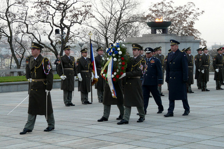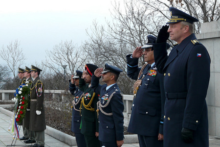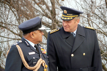 Generál Picek a maršál Naik na tribuně při oficiálním přivítání s vojenskými poctami