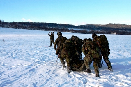 Vojáci transportují zraněného kolegu k přistávajícímu vrtulníku