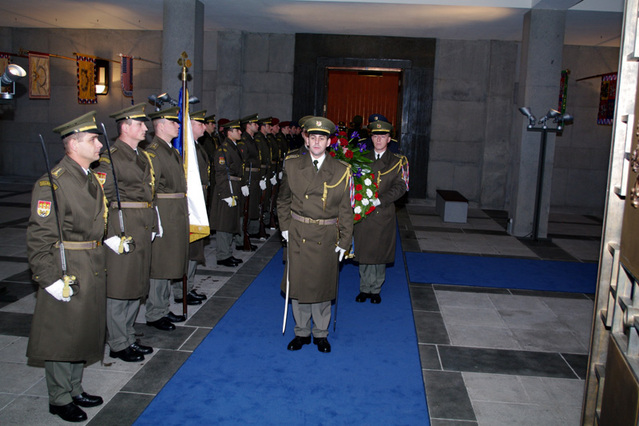 Příslušníci Posádkového velitelství Praha přinášejí věnec ke kolumbáriu Národního památníku na Vítkově