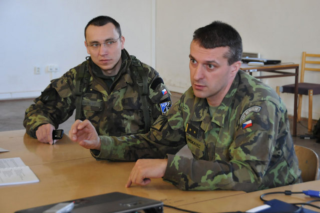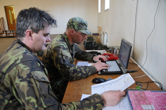 Řídící cvičení - major Alan Dubový (vlevo) s velitelem oddílu podplukovníkem Petrem Prskavcem ve štábu řídícího cvičení