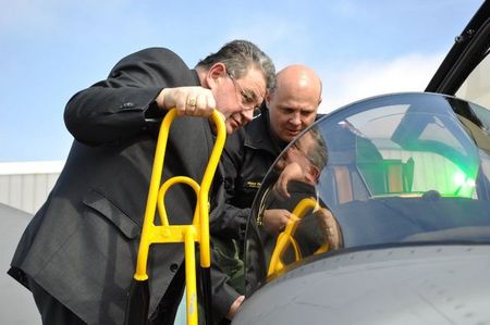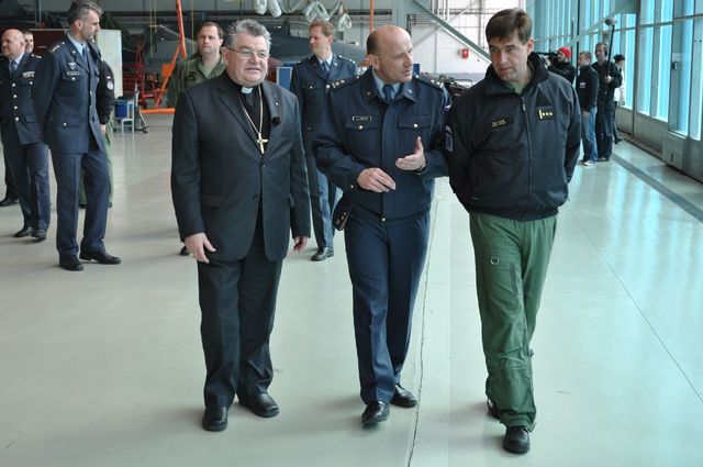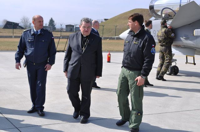 Arcibiskup Dominik Duka a zástupce velitele 211. taktické letky major Otakar Prikner při ukázce letounu J-39 Gripen