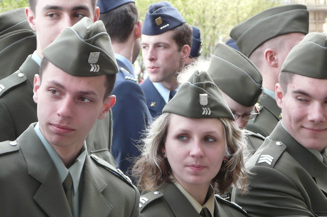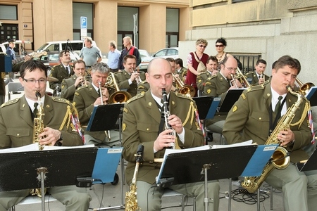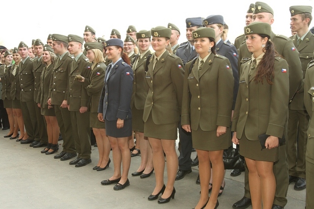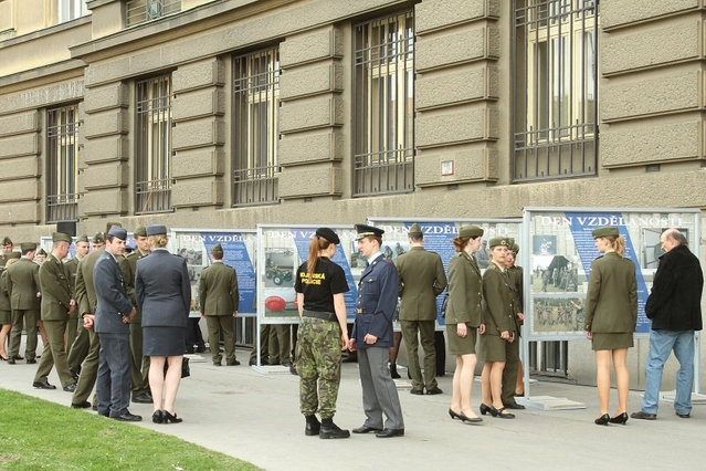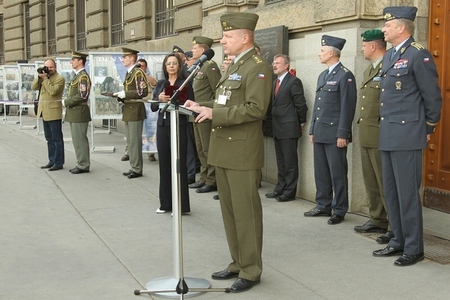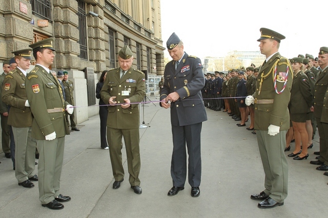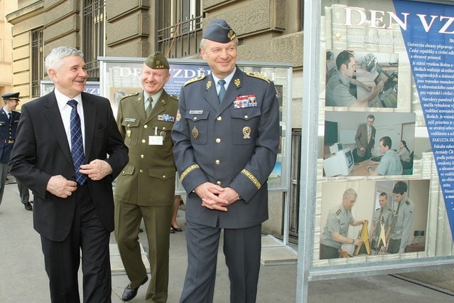 Ředitel sekce personální - personální ředitel MO Vladimír Karaffa, plukovník Jaroslav Průcha a generál Vlastimil Picek si prohlíží expozici