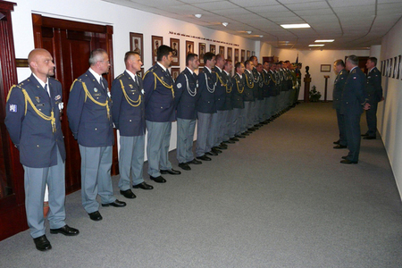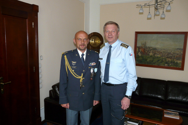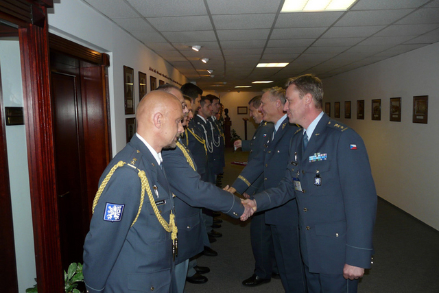 zleva: plukovník Kankia, brigádní generál Dvořák a plukovník Jiří Vávra, velitel 24. základny dopravního letectva gratulují vyznamenaným