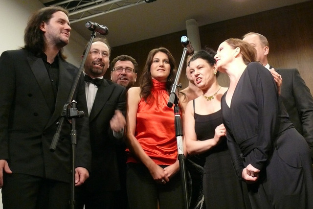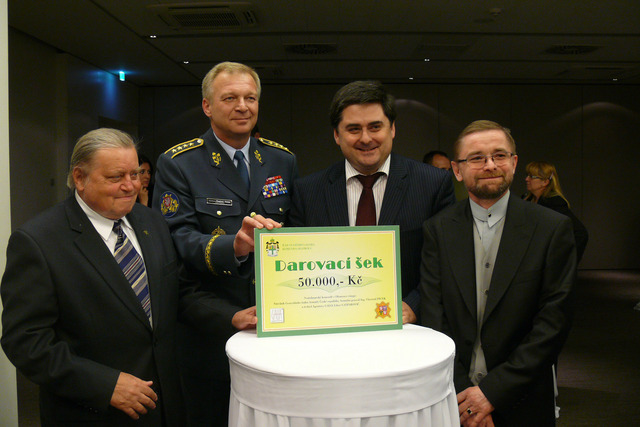 zleva: Václav Žmolík, generál Vlastimil Picek, Libor Gašparovič a profesor Miloš Trapl při předání šeku