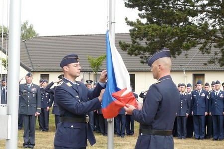 generál  Vlastimil Picek předává státní vlajku ČR generálu Burkhardu Pototzkemu, veliteli komponentu E-3A