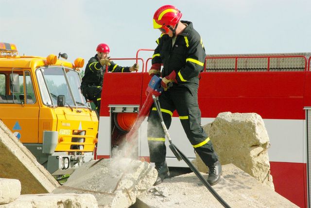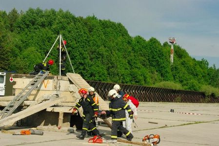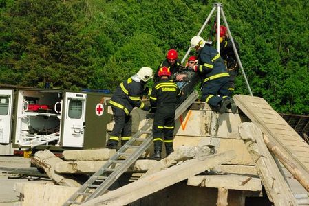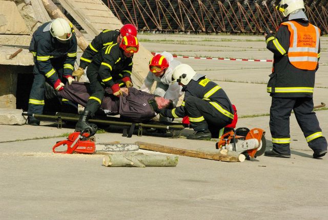 odnášení zraněné osoby do přichystané sanitky