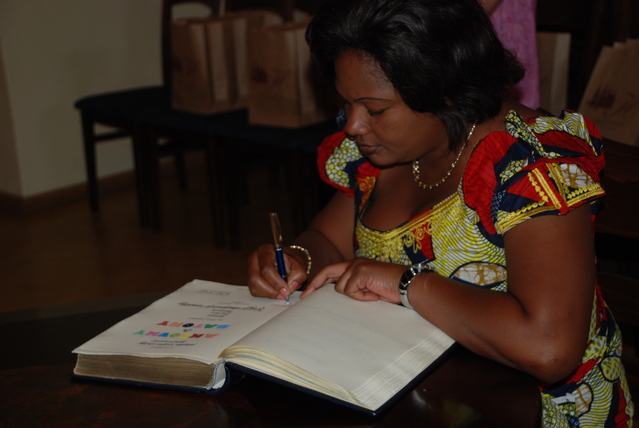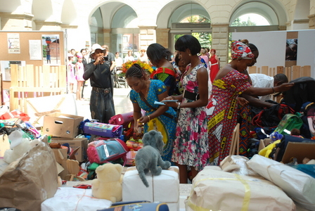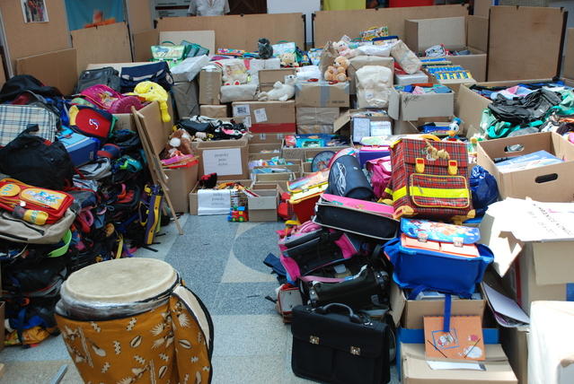 učitelé z Konga přebírají sbírku školních pomůcek a potřeb