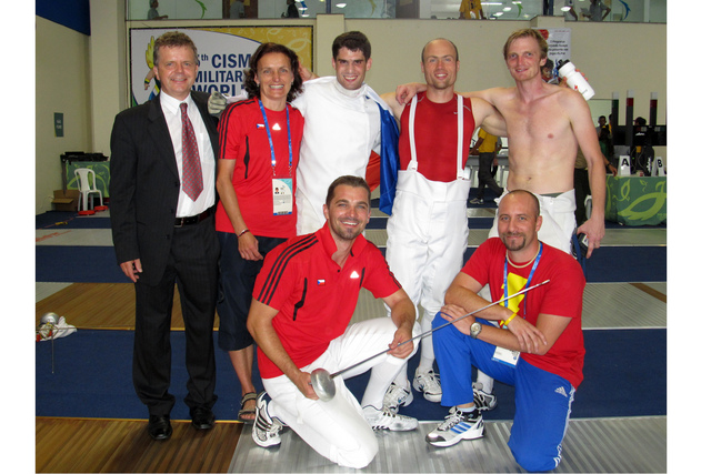 Společné foto sportovců po vítězství npor. Jiřího Janečka v šermu