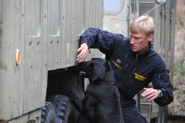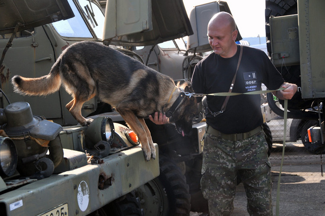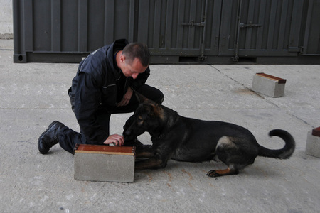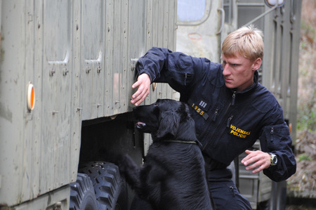 Praporčík Miroslav Vánský se psem Bakem hledají výbušniny