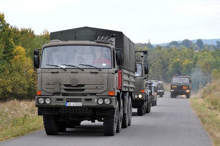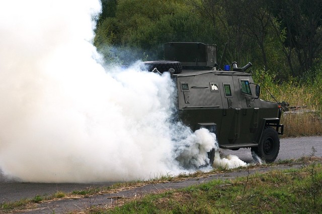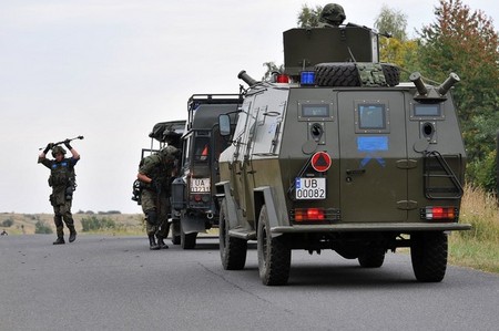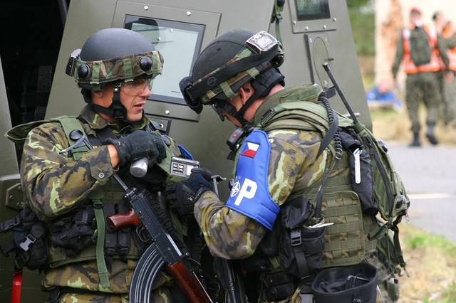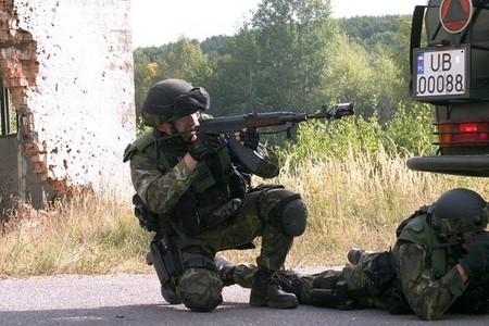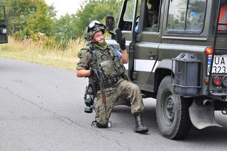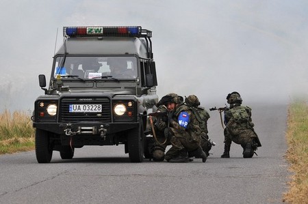 Český vojenský policista se kryje za polským obrněným vozidlem