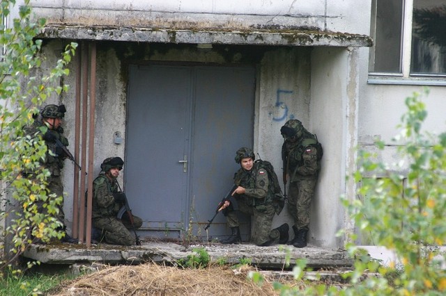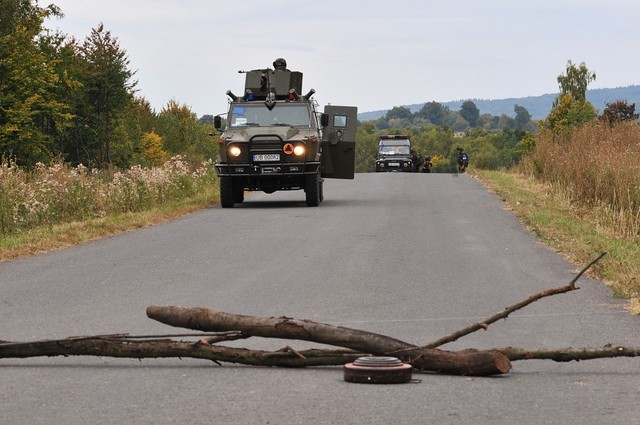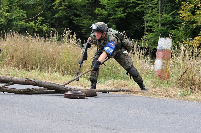 POlský vojenský policista odstraňuje překážku, ta je však zajištěna