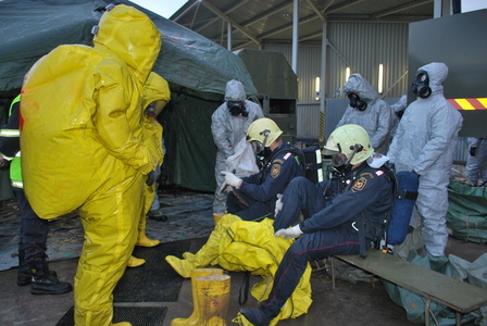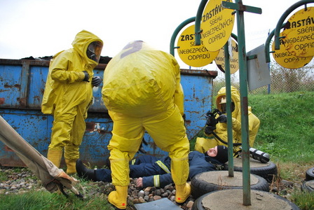 Hasiči odkládají protichemické oděvy na místě dekontaminace osob