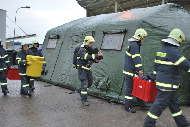 Hasiči přinášejí potřebný materiál na místo dekontaminace osob