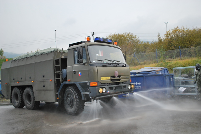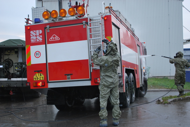 Chemici provádějí dekontaminaci plochy a prostoru nebezpečné zóny.