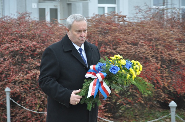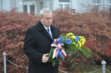 Starosta Miroslav Pišťák pokládá květinu k pietnímu místu