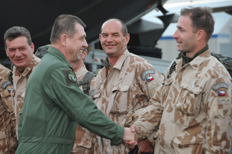 Generál Kankia (vlevo) přivítal každého z poslední dvacítky jednotky na letišti v pražských Kbelích