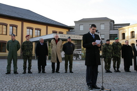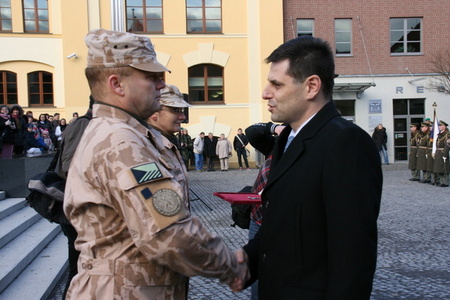NMO Michael Hrbata vyznamenává velitele uskupení plukovníka gšt. J. Štrupla