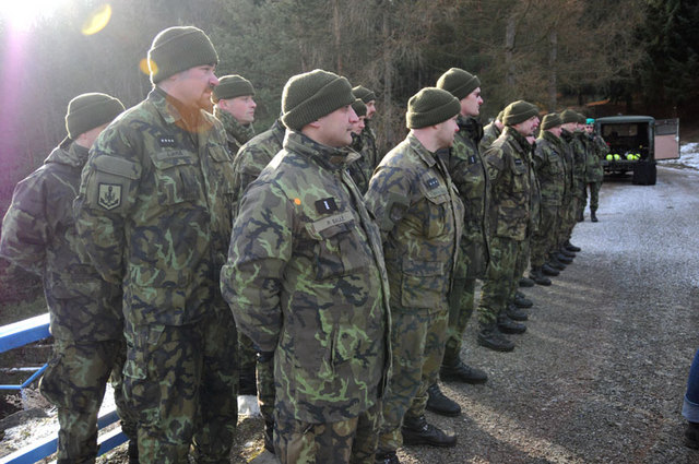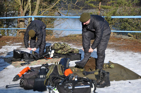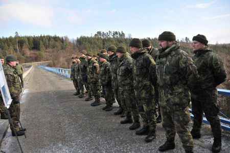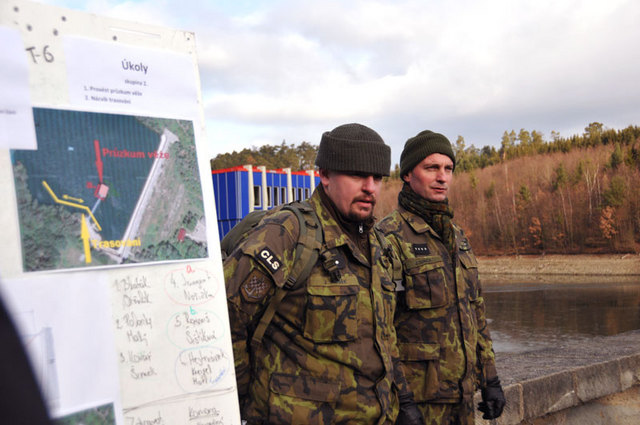 Desátník Jakub Kosek vysvětluje úkoly, které potápěči budoui plnit - v pozadí vedoucí zaměstnání rotný Jiří Spáčil