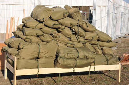 Skládání kontejneru s matracemi na Rohanském ostrově