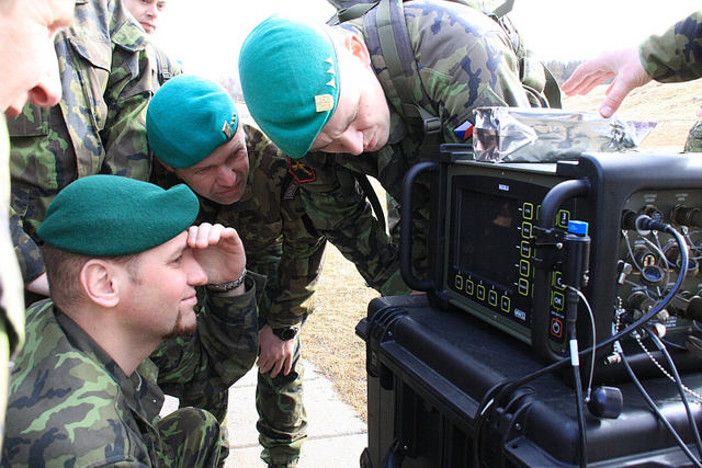 Příslušníci 13. dělostřelecké brigády sledují let balónu na displeji terminálu Marvin