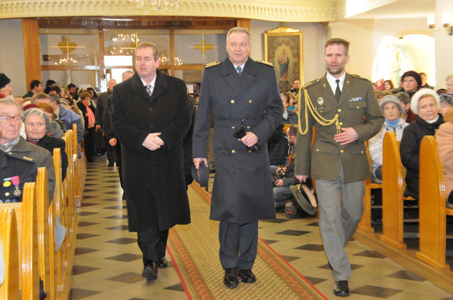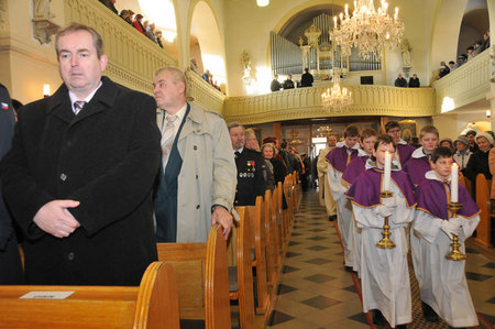 Náměstek ministra obrany Libor Karásek s náčelníkem GŠ AČR generálem Vlastimilem Pickem přicházejí v doprovodu hlavního kaplana AČR plukovníka Jana Kozlera do zcela zaplněného kostela v Horní Bečvě