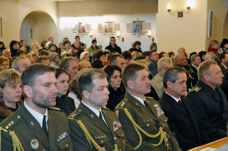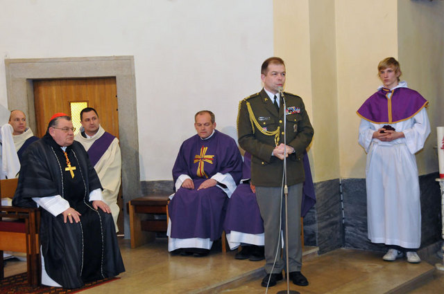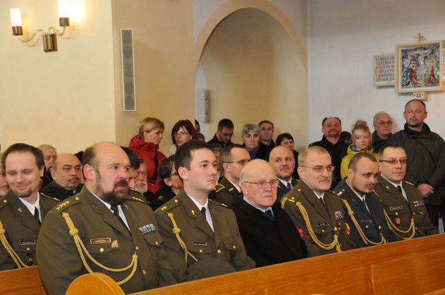 Účastníci slavnosti při bohoslužbě v kostele sv. Jana a Pavla v Horní Bečvě v popředí zleva: hlavní kaplan AČR plk. Jan Kozler, zástupce ředitele VHÚ pplk. Eduard Stehlík, ředitel KVV Zlín plk. Radek Henner, starosta obce Oldřich Ondryáš, náčelník GŠ AČR generál Vlastimil Picek