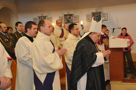 Mši svatou celebroval kardinál Dominik Duka - vlevo v popředí generální sekretář ČBK Mons. Tomáš Holub - první vojenský kaplan v novodobé histrorii české armády
