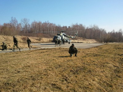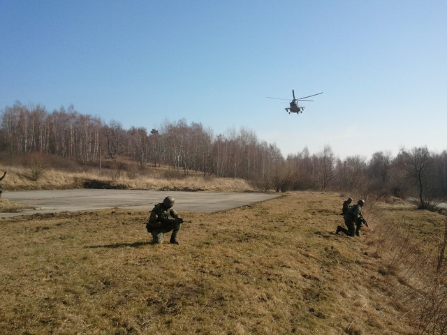 Před přistáním vrtulníku vojáci zajištují prostor