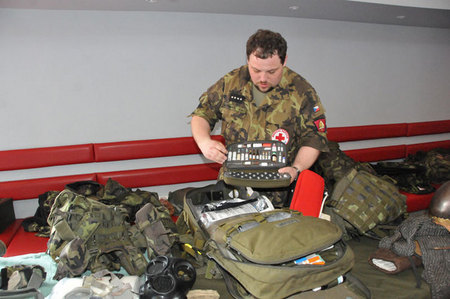 Medik pěší roty a profesionální záchranář - to je rotný Martin Vyskočil. Na snímku představuje obsah svého resuscitačního batohu