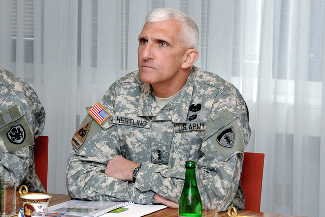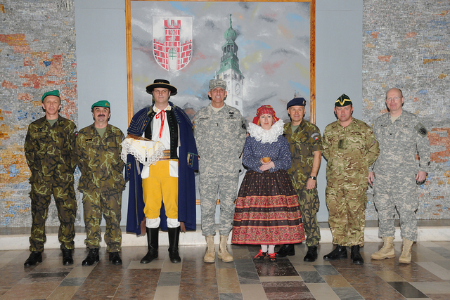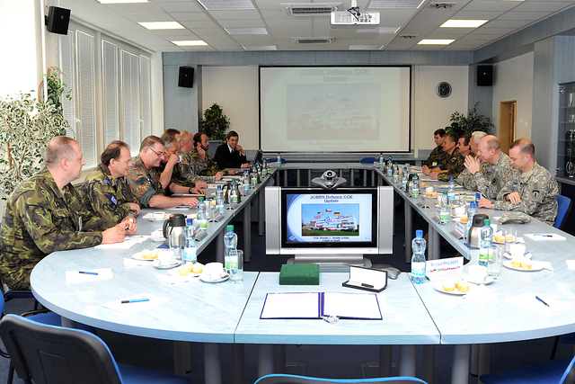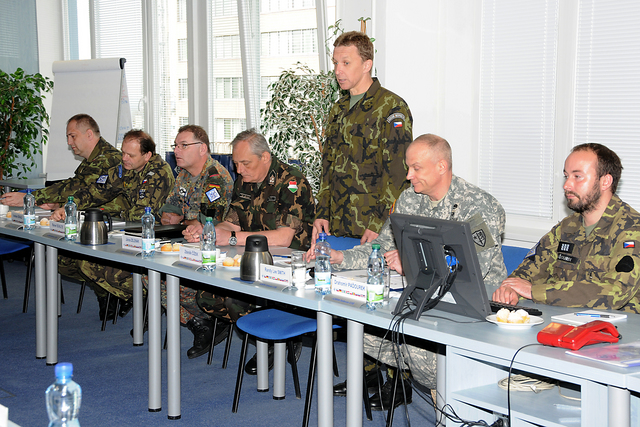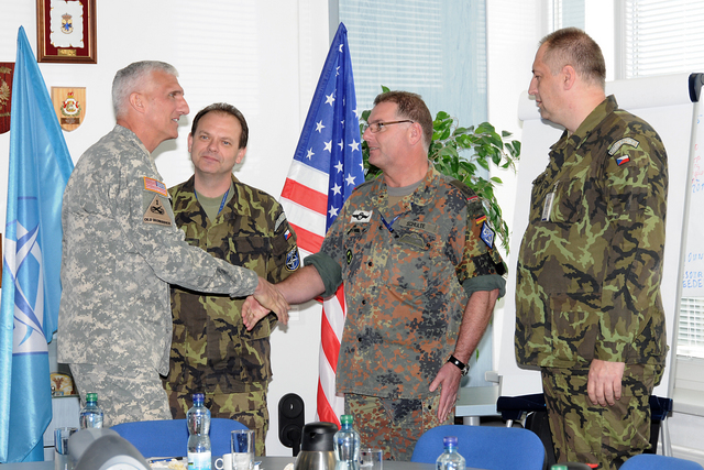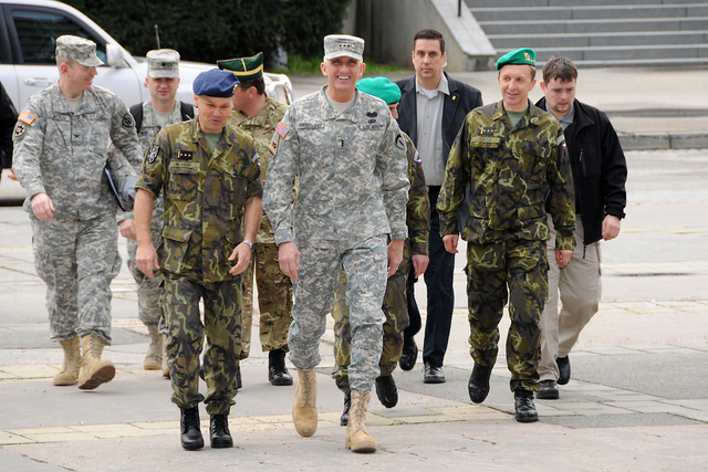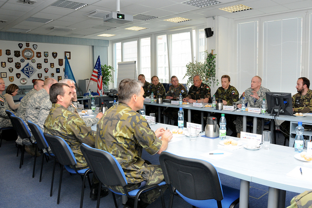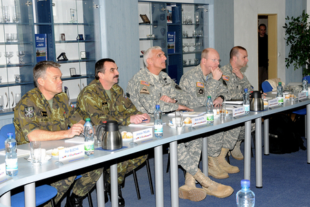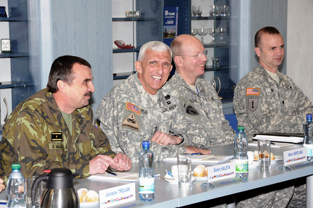 Společné foto : zleva - plukovník Zdeněk Čížek - ředitel COE, brig.gen. Štefan Kaleta - velitel Pozemních sil AČR, genpor. Mark Hertling, NŠ VeV-VA - plk.gšt. Milan Marek, velitel BMATT - plk.Andrew Cuthbert a plk. Wilson - přidělenec obrany USA