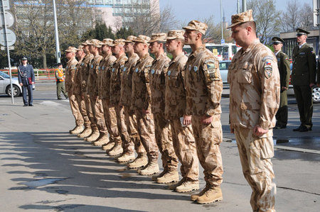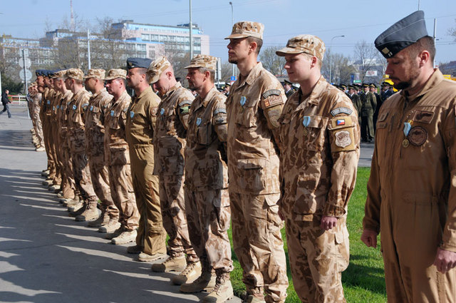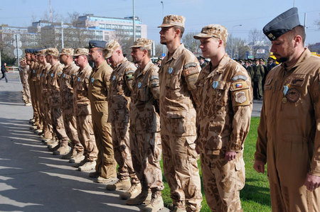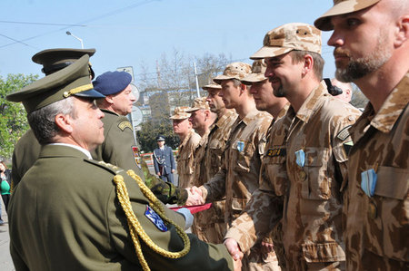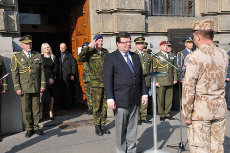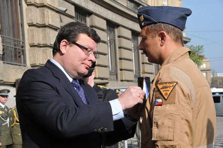 Medaili Za službu v zahraničí přebral od ministra Alexandra Vondry velitel jednotky 5. jednotky AAT (vzdušný poradní tým) podplukovník Petr Kratochvíl