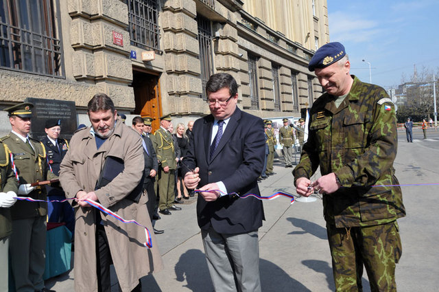 Slavnostním přestřižením pásky byla zahájena výstava věnovaná začátkům působení českých vojáků v zahraničních misích na Balkáně a vojenským pozorovatelům. Zleva: historik Jindřch Marek, ministr obrany Alexandr Vondra a náčelník GŠ AČR generál Vlastimil Picek
