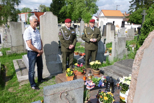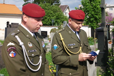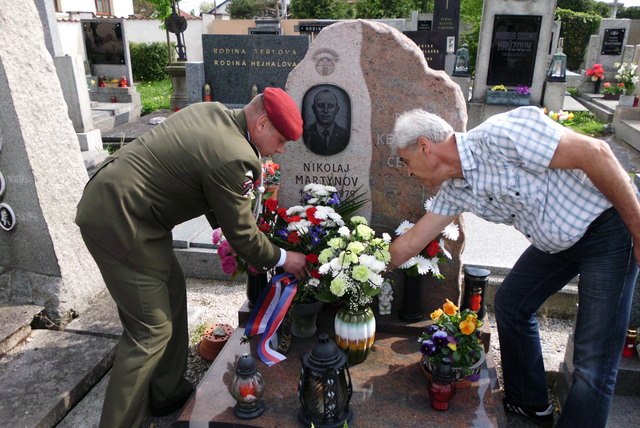 Vrchní praporčík 4. brigády rychlého nasazení praporčík Miloš Prášil a předseda Československé obce legionářské Plzeň Ing. Ivan Čiliak společně pokládají květiny na hrob podpraporčíka in memoriam Nikolaje Martynova.