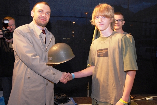 Primátor města Plzně předává kapitánovi Legie T. G. Masaryka Ondřeji Kováříkovi přilbu plukovníka Nobleho, která je putovní cenou.