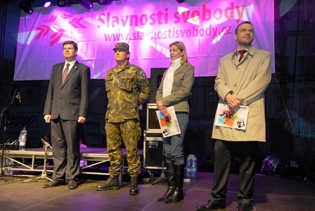 Ceny třem nejlepším týmům soutěže Osvoboď Plzeň předávali, zleva, ministr spravedlnosti Jiří Pospíšil, zástupce ředitele Krajského vojenského velitelství Plzeň podplukovník Slavomír Tomčák, náměstkyně plzeňského primátora Eva Herinková a primátor města Plzně Martin Baxa.