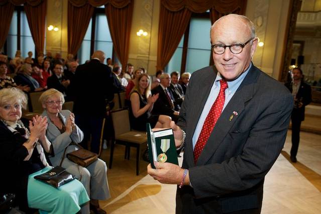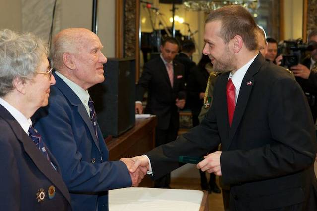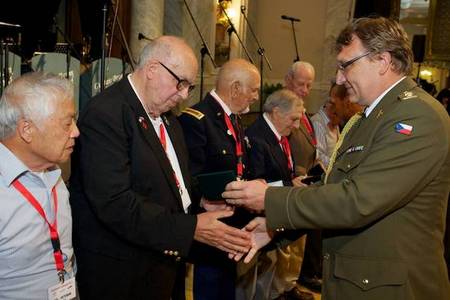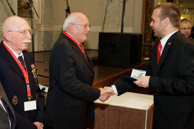 Plzeňský primátor Martin Baxa předává medaili belgickému veteránovi Hubertu Rauwovi, Vpravo stojí Paul Jacobs.